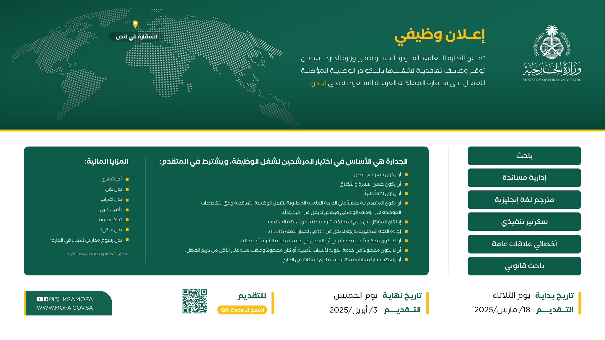 أعلنت (وزارة الخارجية) عبر موقعها الإلكتروني (توتير) عن توفر عدة وظائف تعاقدية لشغلها بالكوادر الوطنية المؤهلة للعمل في سفارة المملكة في لندن وسفارة المملكة في باريس وذلك وفقا للتفاصيل والشروط الموضحة أدناه.