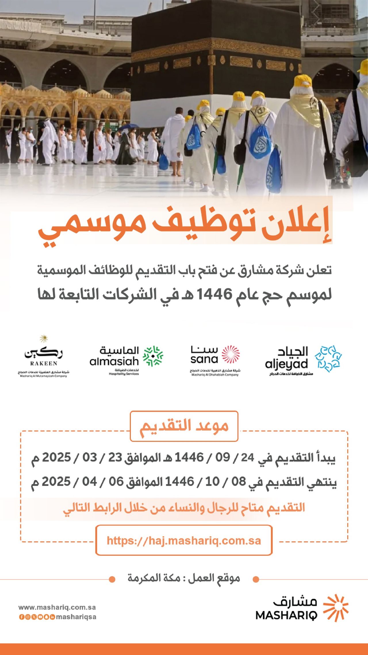 أعلنت شركة مطوفي حجاج دول جنوب شرق آسيا (مشارق) عبر حسابها الرسمي على موقع التوظيف لينكد إن عن فتح باب التقديم على الوظائف الموسمية لموسم حج 1446هـ في الشركات التابعة لها وذلك وفقا للتفاصيل الموضحة كما يلي.