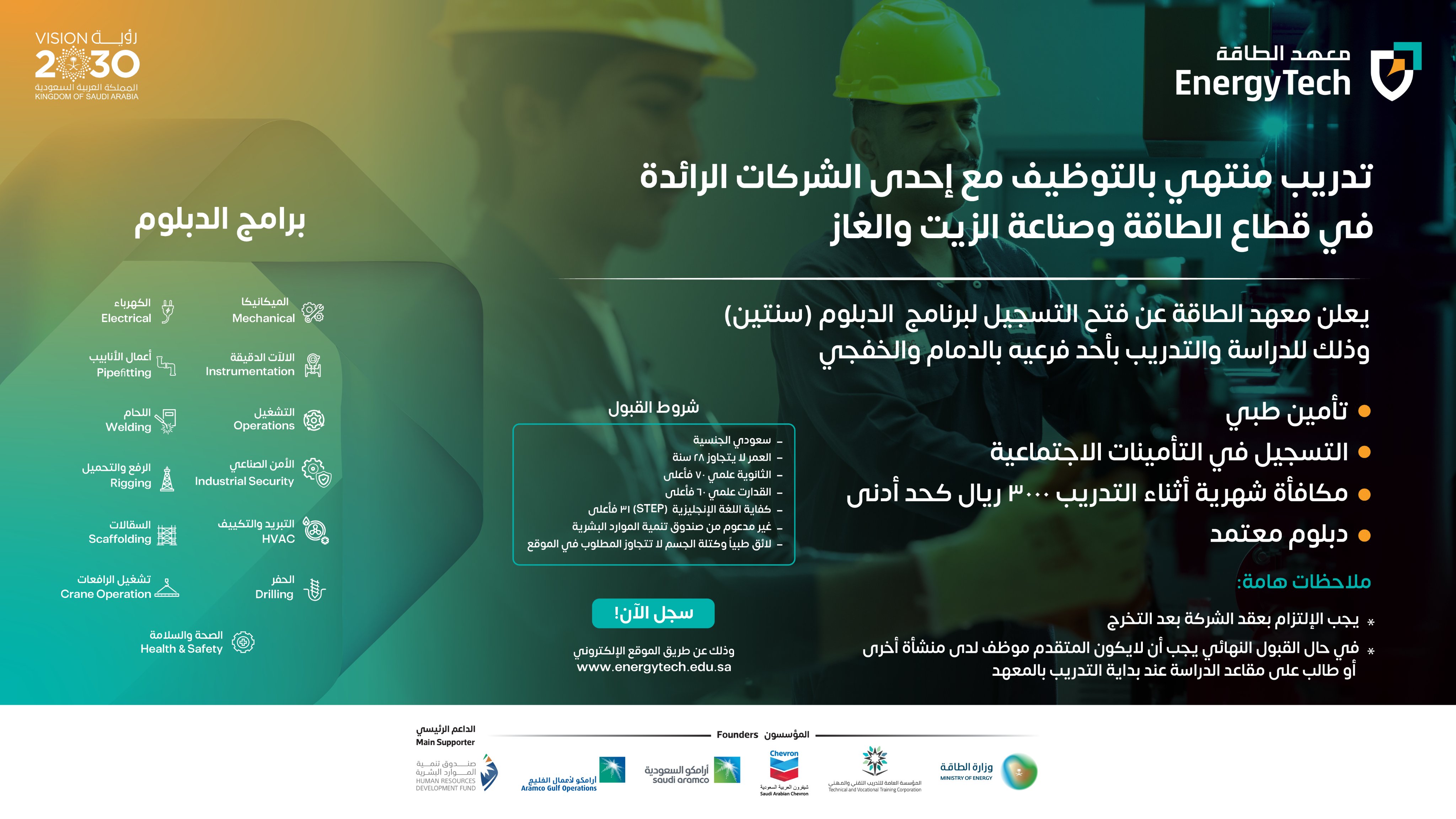 يعلن معهد الطاقة عن بدء التسجيل في برنامج تدريبي منتهي بالتوظيف بالتعاون مع إحدي الشركات الرائدة في قطاع الطاقة وصناعة الزيت والغاز لحملة (الثانوية فأعلي) في أحد فرعي المعهد في (الدمام ، الخفجي) وسنعرض عليكم بقية التفاصيل والمتطلبات في هذا المقال من خلال موقعنا هفيدك بلس.