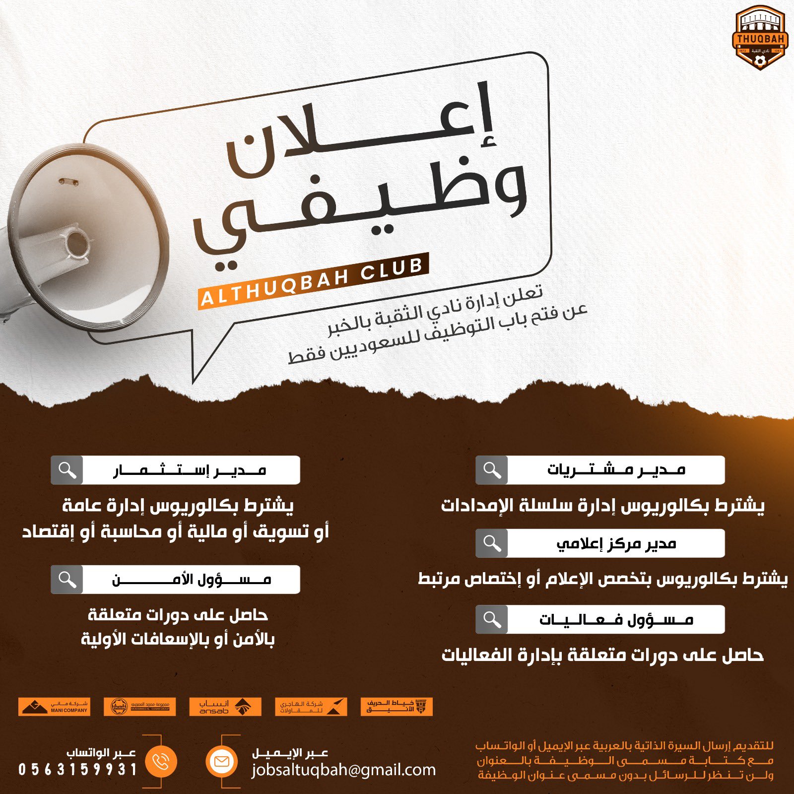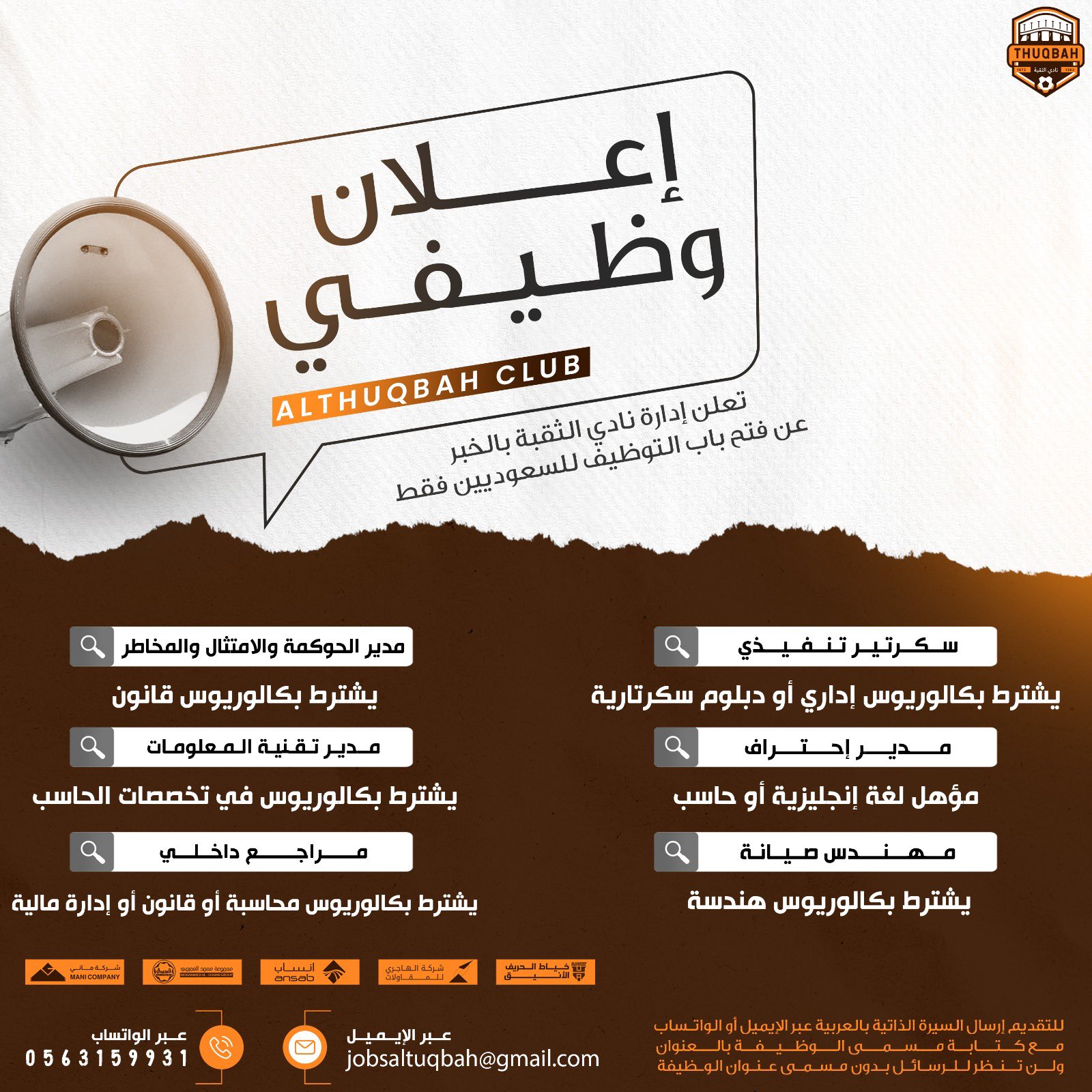 يعلن نادي الثقبة الرياضي عن فتح باب التوظيف في عدد من الوظائف الشاغرة في العديد نت التخصصات المختلفة (إدارية ومالية وأمنية وقانونية وتقنية) وتتوفر هذة الوظائف لحملة الثانوية العامة فما فوق (ذكور وإناث) وذلك للعمل في مدينة الخبر بشرط أن يكون المتقدم أو المتقدمة سعودي الجنسية